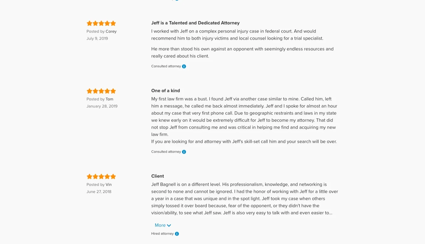 June 27, 2018Jeff Bagnell is on a different level. His professionalism, knowledge, and networking is second to none and cannot be ignored. I had the honor of working with Jeff for a little over a year in a case that was unique and in the spot light. Jeff took my case when others simply tossed it over board because, fear of the opponent, or they didn't have the vision/ability, to see what Jeff saw. Jeff is also very easy to talk with and even easier to contact, either by phone or email, he's always available for his clients. Jeff's work ethic, attention to detail, and willingness to learn new things, which in return makes him better at the end of the day, puts him on that level of awesome. I was truly honored to have worked with Jeff and at the same time grateful to have met him and can call him a friend today.