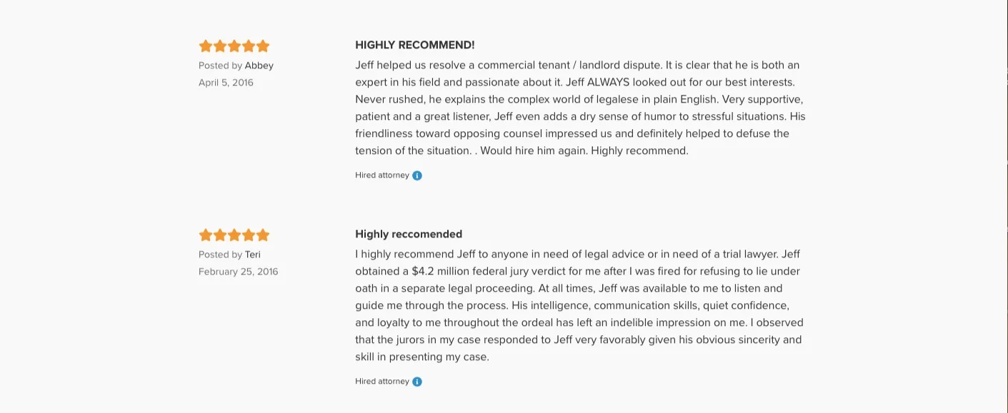 If you are looking for and attorney with Jeff's skill-set call him and your search will be over.This review is from a potential client who consulted with this attorney.